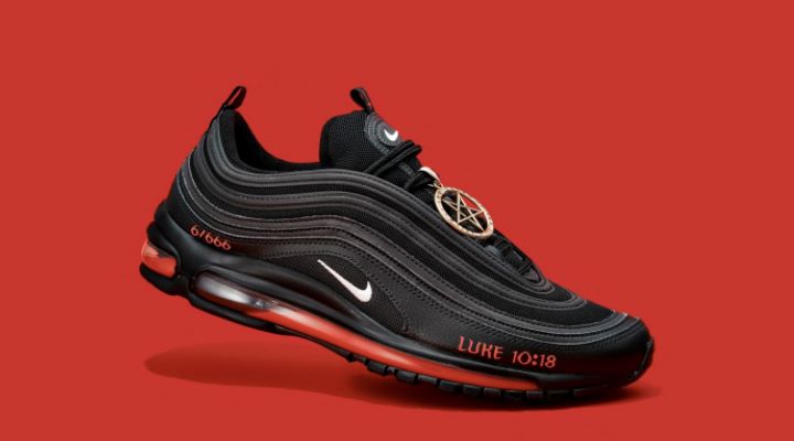 Satan Shoes are customized versions of the Nike Air Max 97 sneakers, with midsoles purporting to contain a drop of human blood, and printed with “Luke 10:18,” a reference to a Biblical verse that alludes to Satan’s fall from heaven.